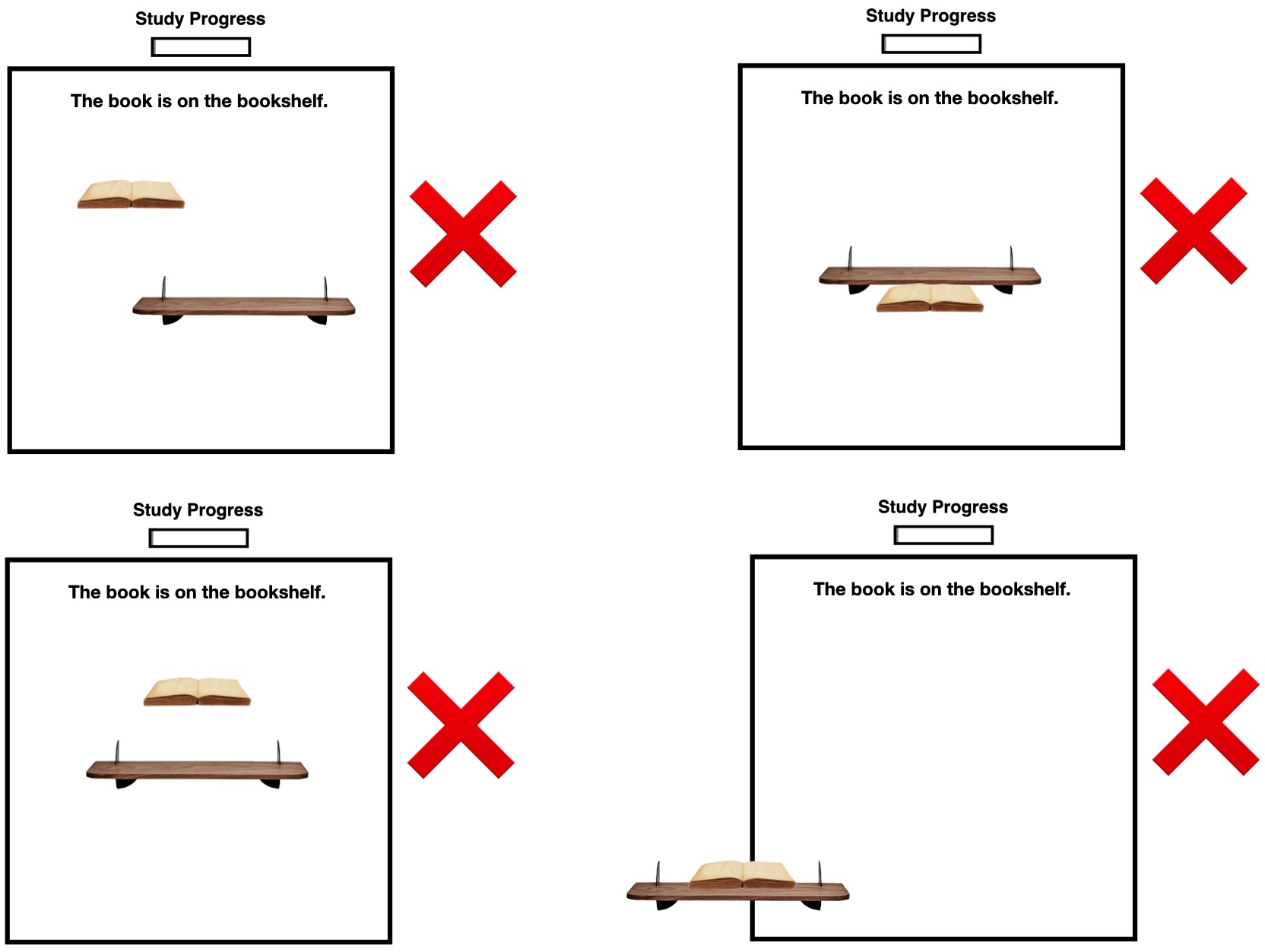 If your composed scene isn't consistent with the statement, or the objects are not fully in the frame, your response will be counted as incorrect. Below are some examples of incorrect depictions: