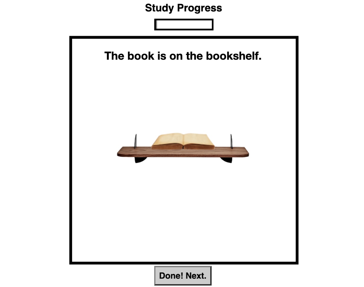 On each trial, you'll be presented with a statement, such as The laptop is on the desk.